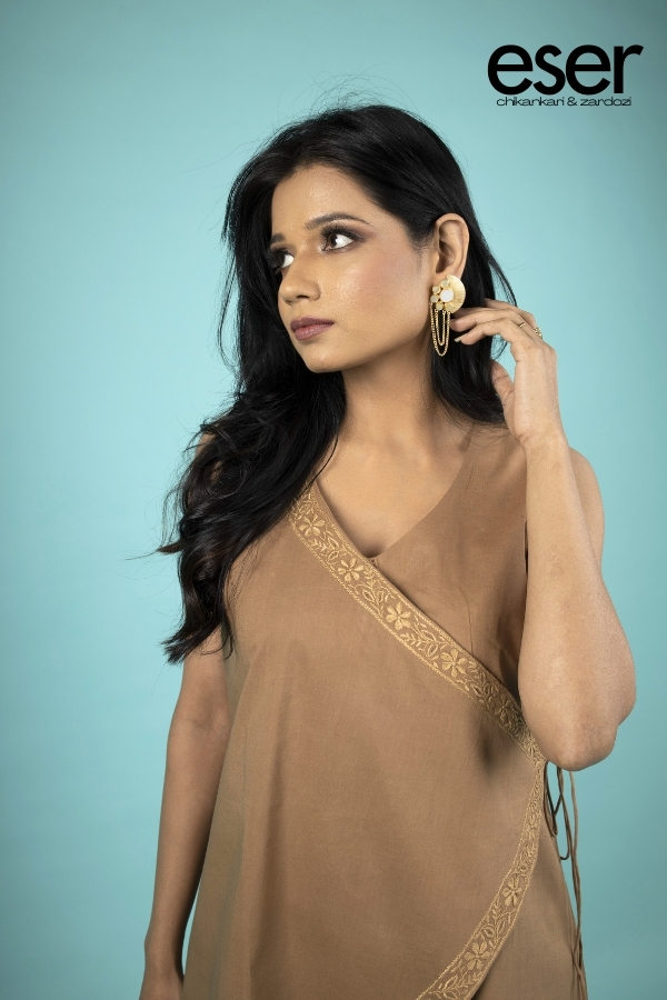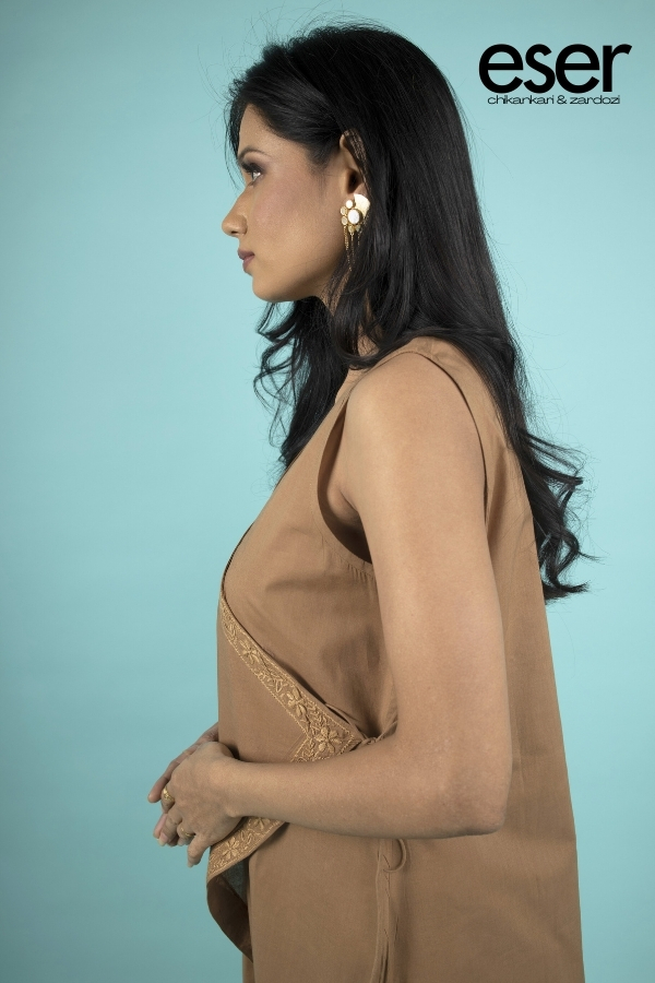 The edges are finished with an exquisitely hand-stitched chikankari border, adding depth, craftsmanship, and a sense of quiet luxury. Effortlessly adaptable, this Angarkha transitions seamlessly from a polished office look to intimate evening occasions, making it a sophisticated wardrobe essential.