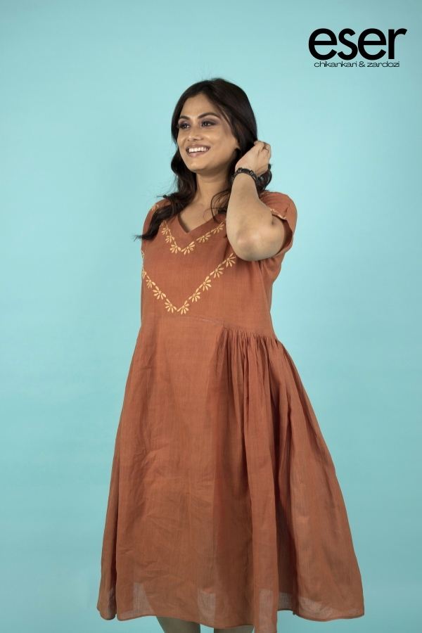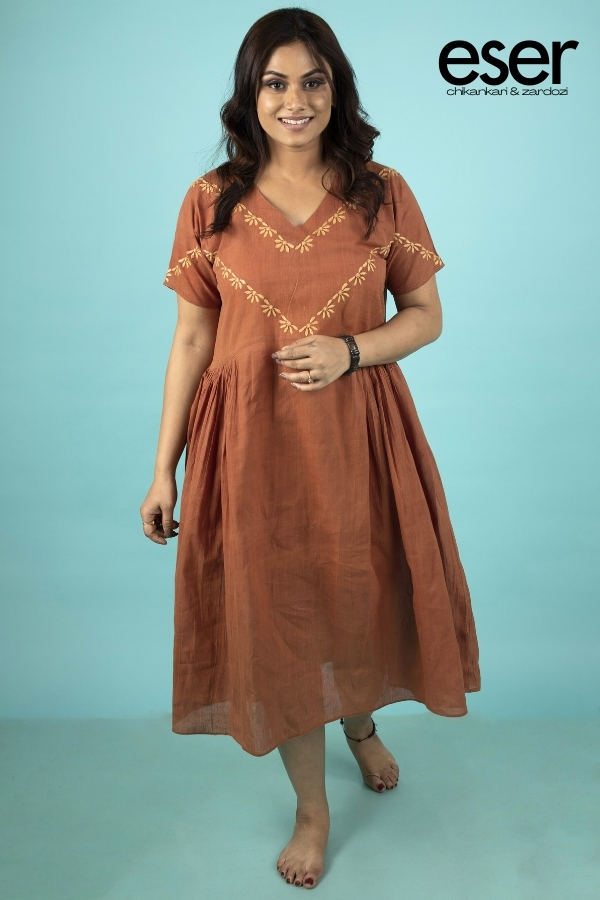 Brown Rust Midi Dress | Eser blends breathable comfort with refined artisanal detail, making it a perfect choice for warm summer days. Crafted from pure cotton, the dress offers a light and airy feel while maintaining a graceful silhouette. The highlight lies in the hand-embroidered chikankari motifs, thoughtfully arranged in a V-shaped placement that begins at the neckline and flows seamlessly onto the sleeves. This intricate detailing beautifully frames the neckline while lending a delicate elegance to the sleeves. Gathered sides enhance movement and create a relaxed yet flattering drape, adding ease and fluidity to the silhouette. Style it with dainty silver jewellery and kolhapuri sandals for effortless daytime elegance, or elevate the look with block heels and a statement bangle for a refined casual outing. Material: Cotton | Size: Chest 42 inches, Length 44 inches Care Instructions: Dry clean or hand wash. Do not bleach. Shipping Information: The product will be shipped within one week of order. Shipping available within India only. Disclaimer: Colour may slightly differ due to screen settings and lighting conditions. The slip does not accompany the dress, unless specifically mentioned in the respective description.