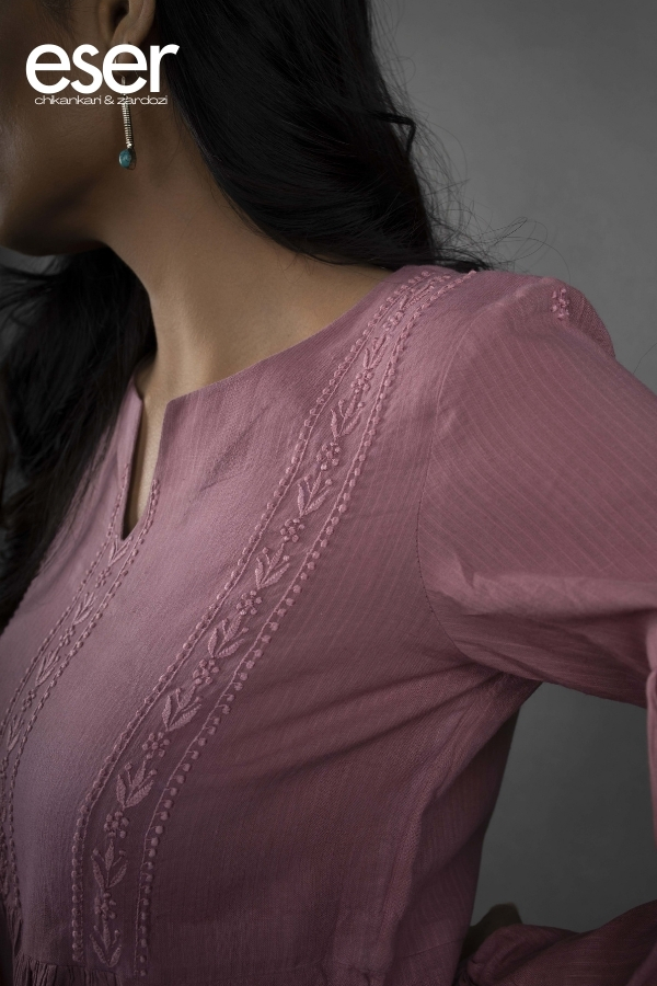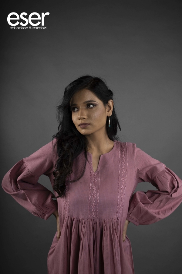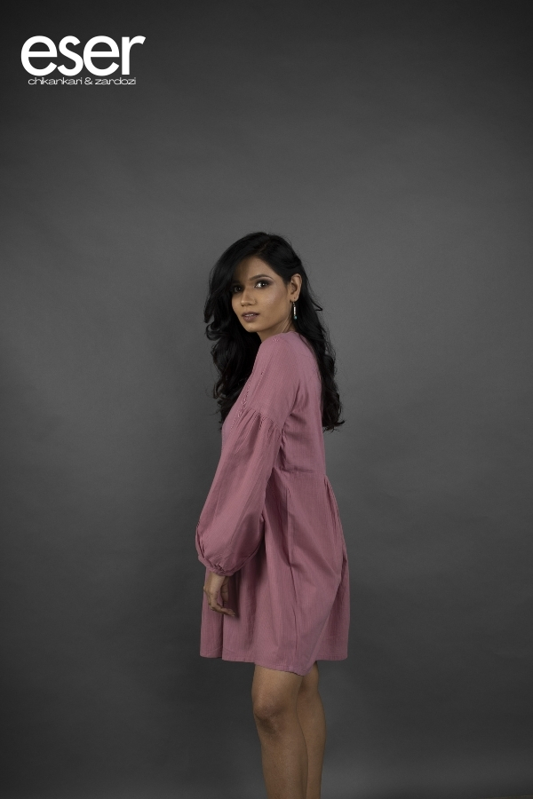 Copper Rose Short Dress | Eser brings together timeless elegance and contemporary ease in a graceful summer silhouette. Crafted from breathable cotton in a soft mauve hue, the dress offers lightweight comfort while maintaining a refined, feminine appeal. The yoke is delicately adorned with chikankari hand embroidery, adding subtle artisanal detail that enhances the understated design. Graceful balloon sleeves lend a soft, flowy character to the silhouette, while the gathered waistline creates a flattering shape that moves effortlessly with the body. With its airy fit and relaxed charm, this dress is perfect for warm summer days—whether styled for brunch, a casual evening out, or a holiday getaway. Material: Cotton | Size: Chest 34 inches, Length 34 inches Care Instructions: Dry clean, hand wash or machine wash with similar light-coloured garments. Do not bleach. Shipping Information: The product will be shipped within one week of order. Shipping available within India only. Disclaimer: Colour may slightly differ due to screen settings and lighting conditions. The slip does not accompany the dress, unless specifically mentioned in the respective description.