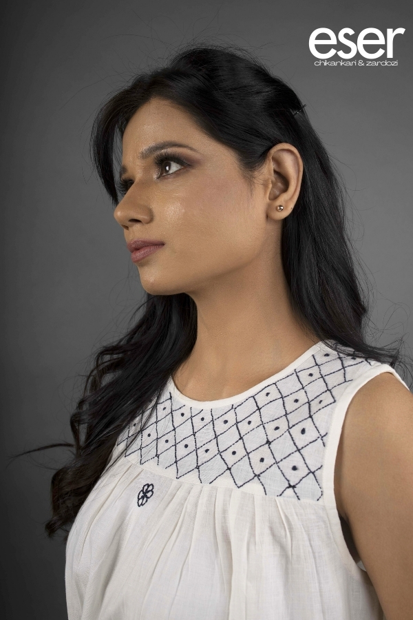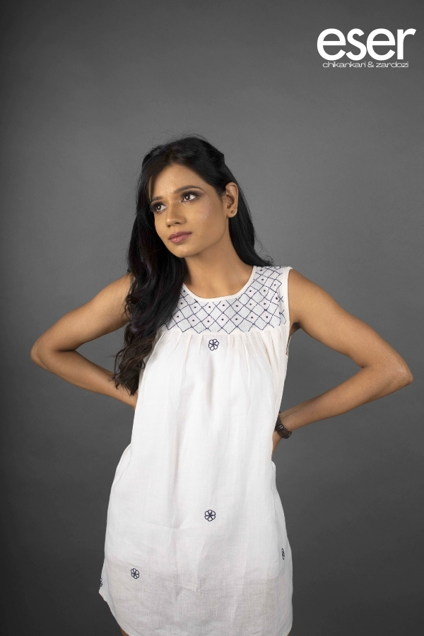 The yoke is adorned with intricate hand-embroidered chikankari, where diamond-shaped jaal and delicate motifs unfold in deep blue threads—creating a striking yet refined contrast. A graceful round neckline and sleeveless silhouette lend the dress a modern, airy charm, while the fluid drape moves with quiet elegance. Designed to transition seamlessly from sunlit afternoons to relaxed evening gatherings, this piece embodies contemporary ease with a timeless soul.