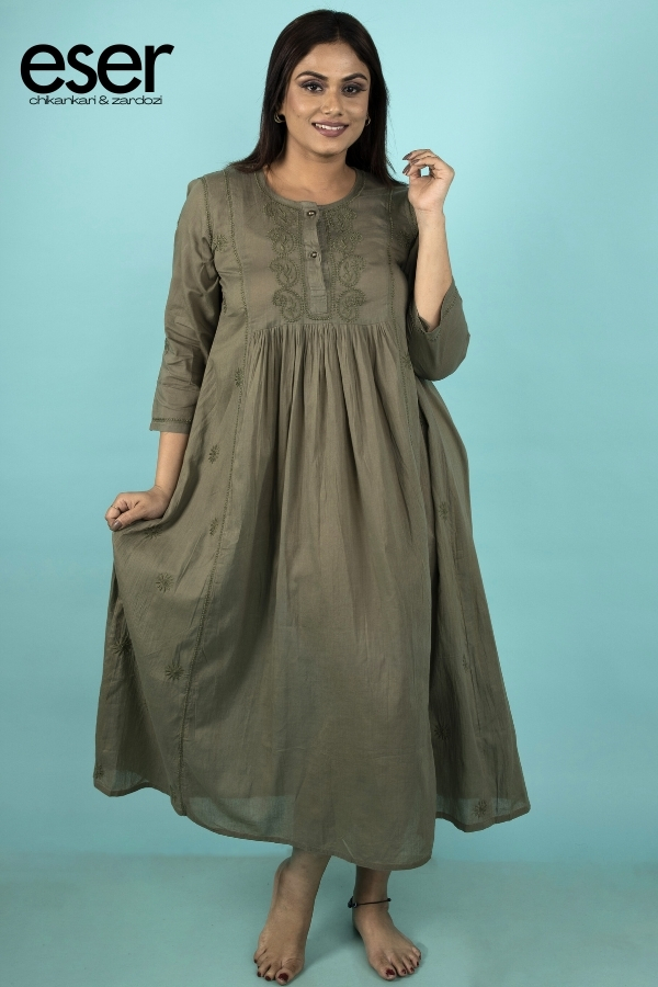 Military Kurta Patti | Eser captures attention with its refined silhouette and artisanal detailing. Crafted from breathable malmal fabric in a rich military green hue, the kurta offers effortless comfort while maintaining a graceful and elegant presence. The highlight of the piece is the delicate hand-embroidered chikankari murri work, thoughtfully placed along the neckline and extending gracefully onto the side kalis, adding movement and subtle texture to the design. A classic front kurta patti with button opening lends a traditional touch, while the three-quarter sleeves balance comfort with timeless style. Falling to a graceful mid-calf length, this versatile piece transitions seamlessly from relaxed daytime wear to festive gatherings. Material: Malmal | Size: Chest 40 inches, Length 47 inches Alteration possible to a smaller size Care Instructions: Dry clean, hand wash or machine wash with similar coloured garments. Do not bleach. Shipping Information: The product will be shipped within one week of order. Shipping available within India only. Disclaimer: Colour may slightly differ due to screen settings and lighting conditions. The slip does not accompany the dress, unless specifically mentioned in the respective description.