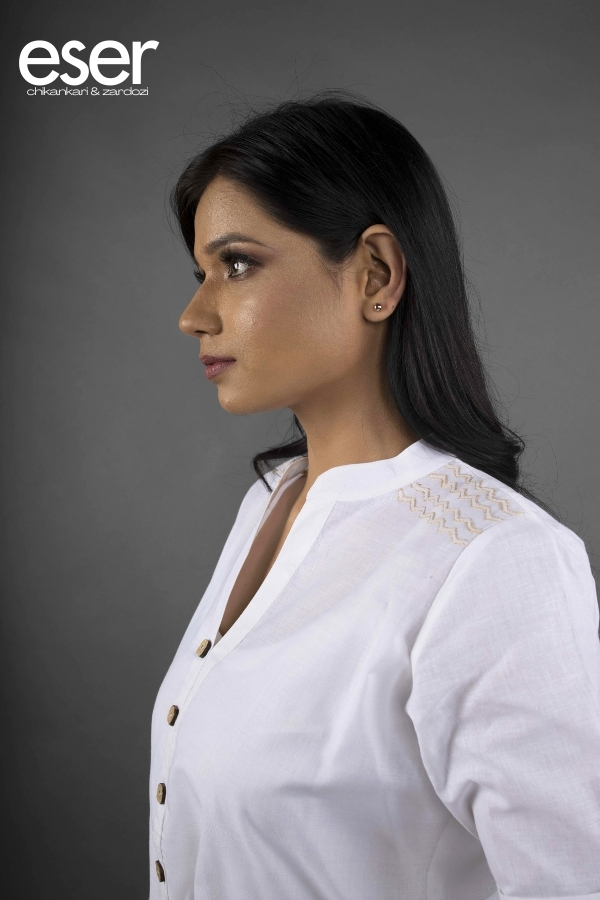 White Short A Line Dress | Eser blends everyday comfort with modern elegance, making it a versatile addition to any wardrobe. Crafted from breathable cotton, the dress offers a light and airy feel that is perfect for effortless daytime styling. The design is elevated with delicate chikankari embroidery along the hemline and shoulders, intricately crafted in thread that harmonises with the button detailing for a refined and cohesive look. A structured band collar with a front button placket lends a polished finish, while the half sleeves with flap accents and button embellishments add a subtle touch of sophistication. The short A-line silhouette ensures ease of movement while maintaining a flattering shape, making it ideal for casual outings as well as smart day events. Material: Cotton | Size: Chest 38 inches, Length 33 inches Alteration possible to a smaller size Care Instructions: Dry clean, hand wash or machine wash with similar light-coloured garments. Do not bleach. Shipping Information: The product will be shipped within one week of order. Shipping available within India only. Disclaimer: Colour may slightly differ due to screen settings and lighting conditions. The slip does not accompany the dress, unless specifically mentioned in the respective description.