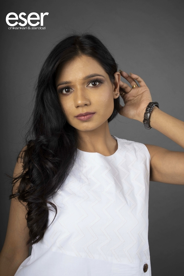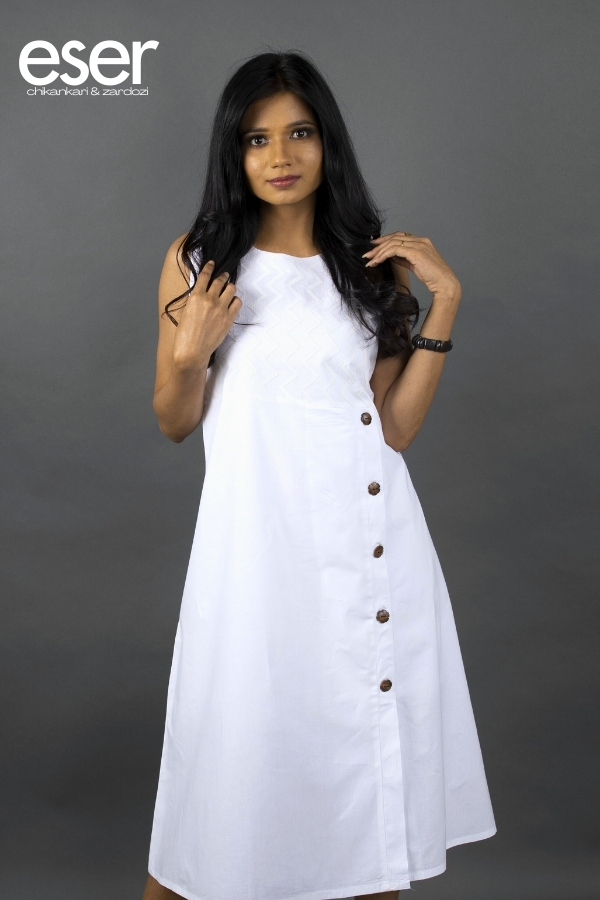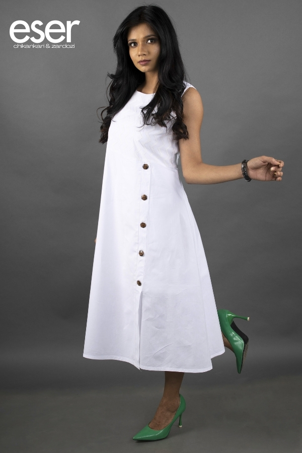 White Sleeveless Dress | Eser reflects timeless elegance with a clean, airy silhouette crafted from breathable cotton. Designed for effortless comfort, the dress carries a refined simplicity that makes it perfect for both casual days and relaxed semi-formal occasions. The yoke is beautifully highlighted with delicate zigzag hand embroidery, adding a subtle artisanal charm to the design. A classic round neckline frames the silhouette, while a stylish front button-down opening from the waist is detailed with contrasting wooden buttons for a chic, contemporary touch. The A-line cut enhances movement and ease, creating a flattering flow that blends comfort with understated sophistication. Material: Cotton | Size: Chest 36 inches, Length 43 inches Care Instructions: Dry clean, hand wash or machine wash with similar light-coloured garments. Do not bleach. Shipping Information: The product will be shipped within one week of order. Shipping available within India only. Disclaimer: Colour may slightly differ due to screen settings and lighting conditions. The slip does not accompany the dress, unless specifically mentioned in the respective description.