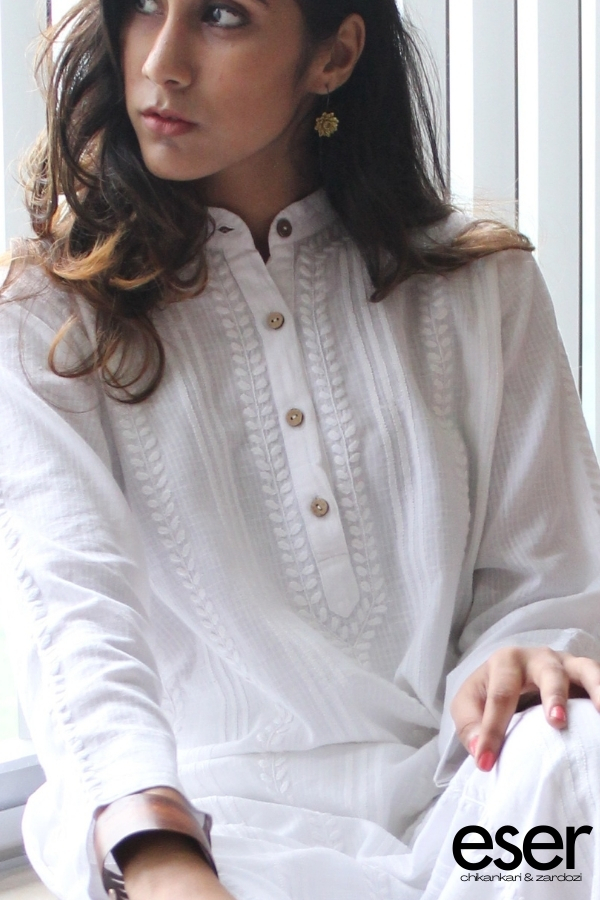The design is refined with delicate chikankari bail embroidery along the neckline, sleeve edges, and side panels—intricate yet understated, enhancing the kurta’s timeless appeal. Its versatile length and minimalist lines make it ideal for everyday refinement as well as understated occasion wear.