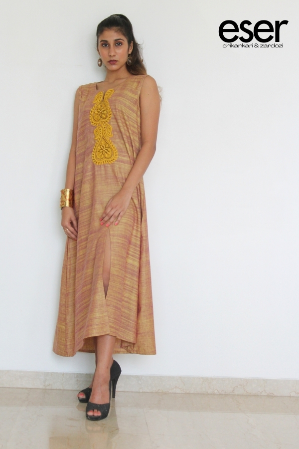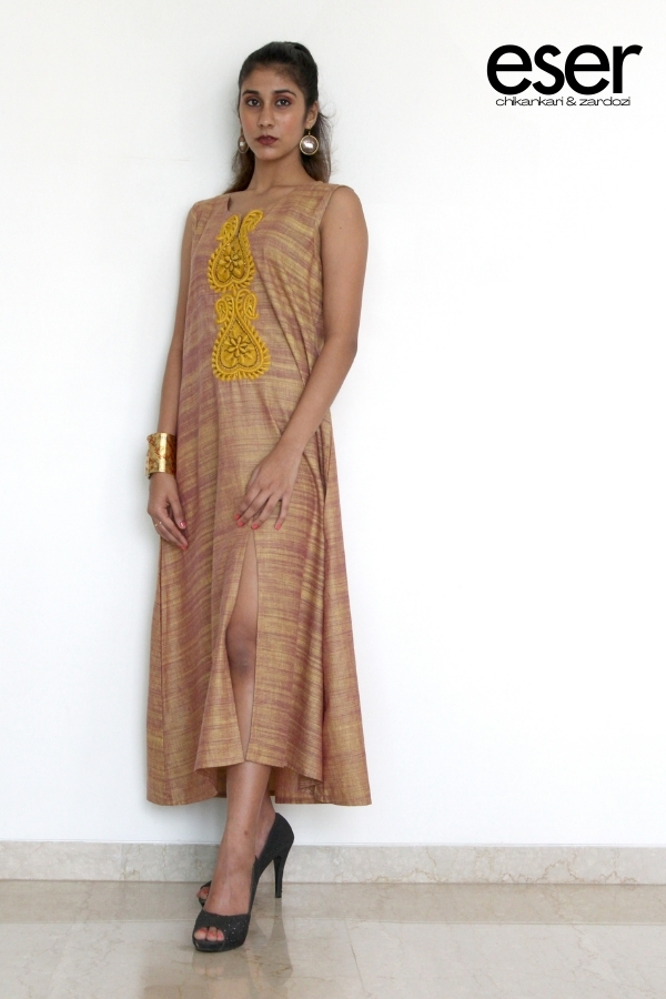 Zardozi Yarn Dye Dress | Eser elevates everyday ethnic style with a graceful long silhouette crafted from breathable cotton slub yarn-dyed fabric. The material carries soft earthy tones and a naturally textured weave, giving the dress a subtle depth and artisanal character. The front is adorned with delicate yellow thread zardozi embroidery, forming intricate paisley motifs that celebrate traditional craftsmanship while maintaining a refined contemporary appeal. Designed with a sleeveless silhouette for ease and comfort, the dress also features a side slit that enhances movement and adds a touch of effortless sophistication. Ideal for festive occasions, relaxed gatherings, or elegant daytime wear. Material: Cotton Slub Yarn Dye | Size: Chest 40 inches, Length 48 inches Alteration possible to a smaller size Care Instructions: Dry clean or hand wash. Do not bleach. Shipping Information: The product will be shipped within one week of order. Shipping available within India only. Disclaimer: Colour may slightly differ due to screen settings and lighting conditions.